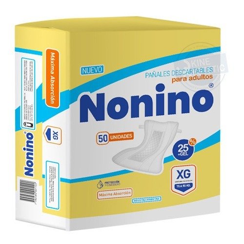 Pañales rectos descartables Nonino, unisex para adultos de uso hospitalario o geriátrico. Tiene bandas adhesivas de ajuste y gran poder de absorción.